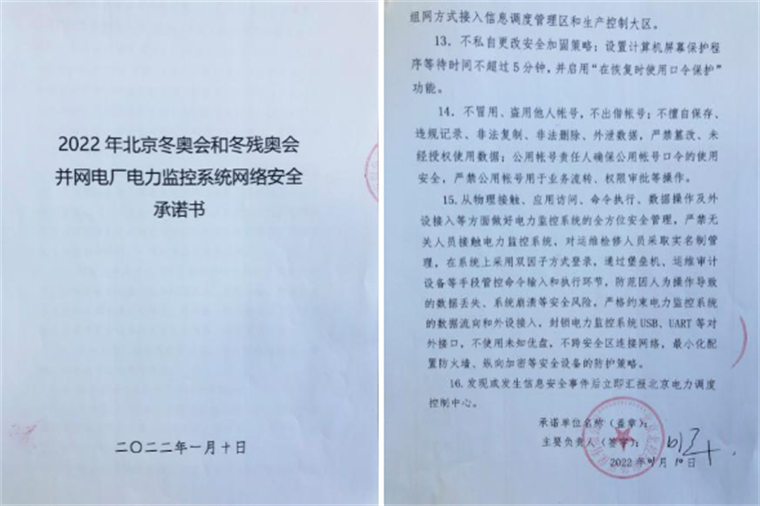 ▲北控綠海能公司黨支部書記、常務副總經理田鋒與國網北京市電力公司簽署了《2022年北京冬奧會和冬殘奧會并網電廠電力監控系統網絡安全承諾書》,承諾履責擔當,保障冬奧會期間供電正常。