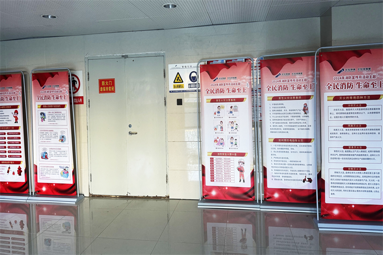 公司在綜合樓大廳和生產樓北門利用電子屏循環滾動播放消防宣傳月活動主題,擺放宣傳展板,并在北門廳播放消防知識視頻,渲染消防宣傳月活動氛圍,提高職工消防安全意識。