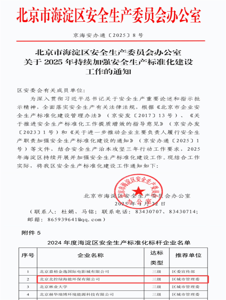 近日,北京市海淀區安全生產委員會辦公室公布了2024年度海淀區安全生產標準化標桿企業名單,北控綠海能公司從眾多參評企業中脫穎而出,光榮上榜。這一殊榮不僅標志著北控綠海能公司在安全生產管理體系、風險防控能力及標準化建設方面取得重要突破,更對行業安全生產標準化建設起到了積極的引領和示范作用。